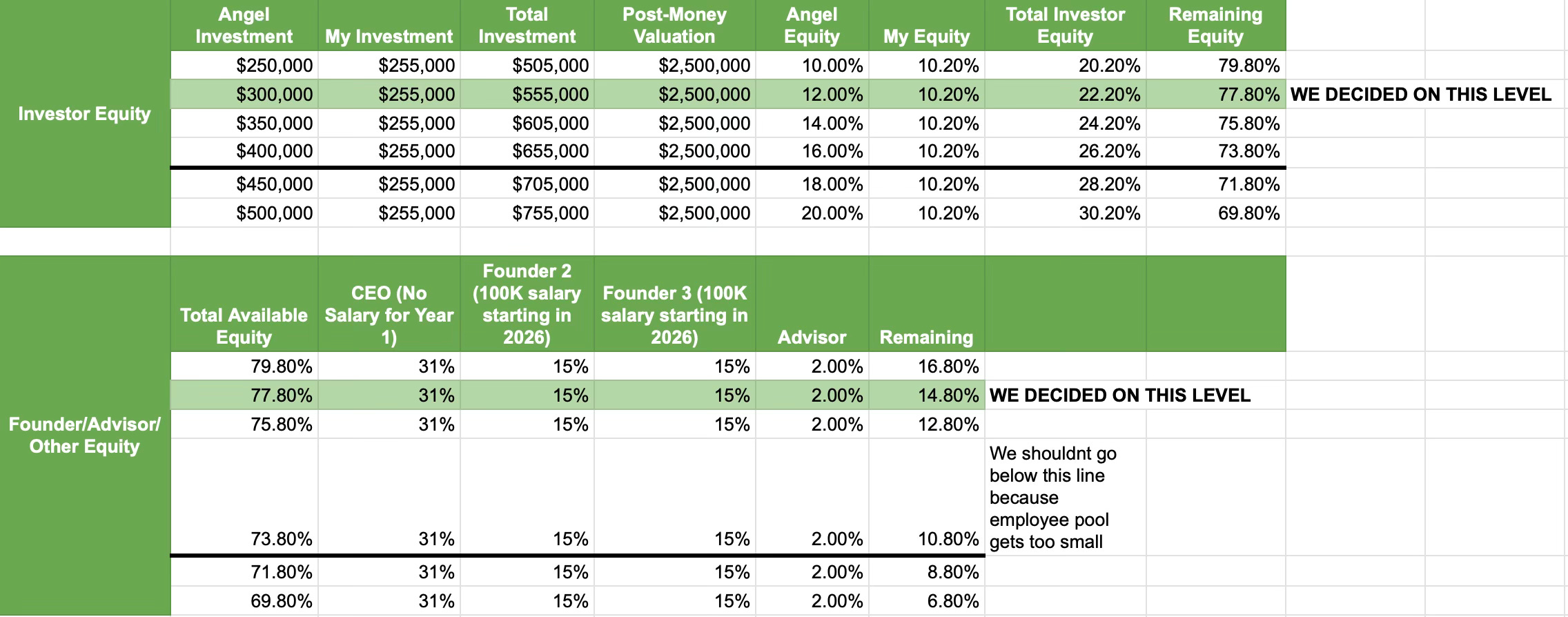 I’m still going to have a lawyer draw up the actual share purchase agreements and stockholder agreements. But this cap table clearly laid out everything and made the story easy to tell: where the percentages came from, how I landed on $300K, why it gave me the wiggle room I needed.